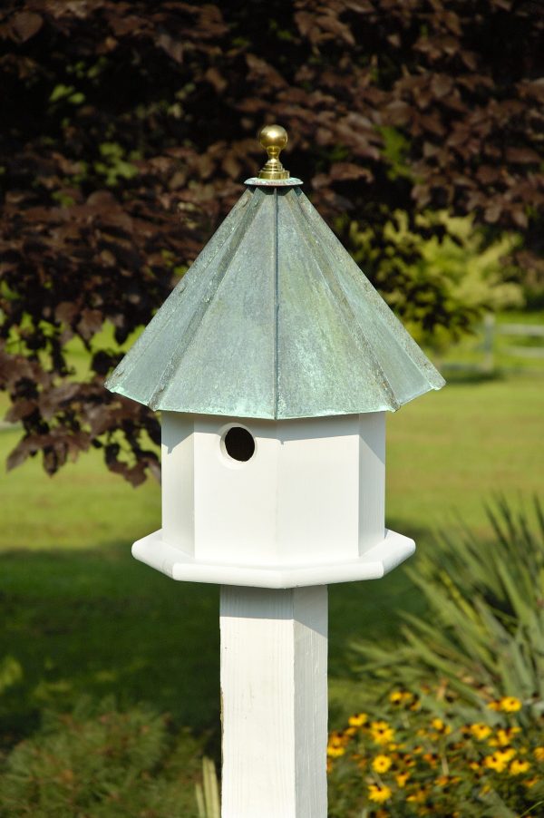 Bright white body topped by solid copper ridged roof and solid brass finial. Roof removes for easy cleaning. Bracket and screws included for easy post mounting.